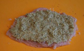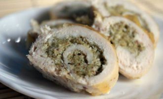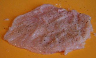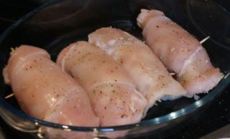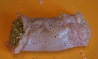 • Аккуратно свернуть рулетиком и сколоть зубочистками. Посолить и поперчить сверху.