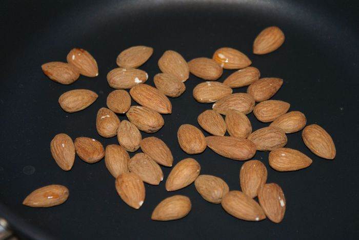 • Миндаль обжарить на сухой сковороде 5 минут. Обязательно помешивать, чтобы не сгорел.