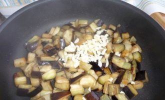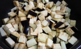 • Баклажан порезать небольшими кубиками. Обжарить в разогретом растительном масле до румяного состояния.