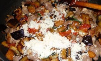 • Добавить отварные куриные сердечки, прогреть, постоянно помешивая. Пармезан натереть на мелкой терке. Добавить сыр.