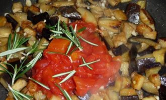 • Влить томаты в собственном соку, розмарин нарвать, протушить пару минут. Соль, специи по вкусу.
