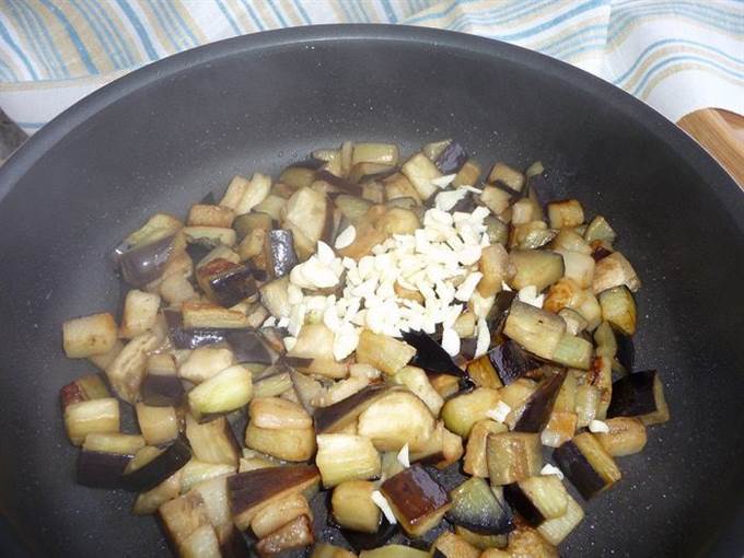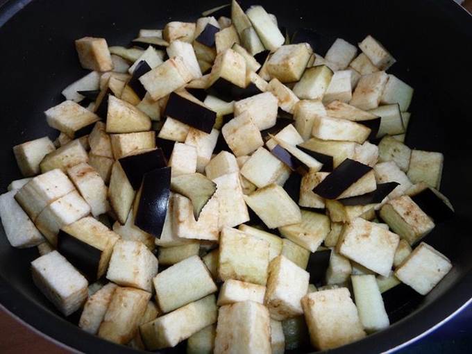 • Баклажан порезать небольшими кубиками. Обжарить в разогретом растительном масле до румяного состояния.