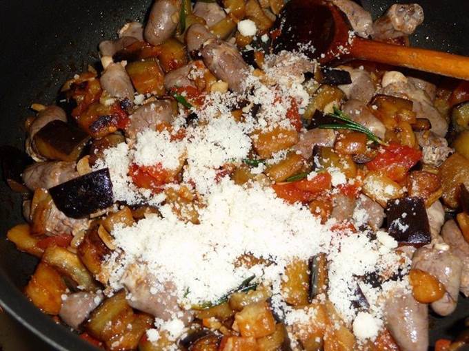 • Добавить отварные куриные сердечки, прогреть, постоянно помешивая. Пармезан натереть на мелкой терке. Добавить сыр.