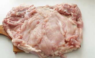 Курицу разрезать вдоль хребта, аккуратно удалить косточки вместе с хребтом.