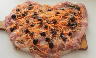 Выложить порезанный чернослив, крупные кусочки грецкого ореха, тонконашинкованную морковь, посолить, поперчить, посыпать сухим желатином.