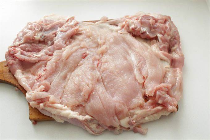Курицу разрезать вдоль хребта, аккуратно удалить косточки вместе с хребтом.