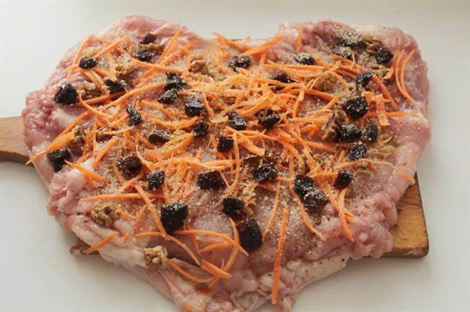 Выложить порезанный чернослив, крупные кусочки грецкого ореха, тонконашинкованную морковь, посолить, поперчить, посыпать сухим желатином.