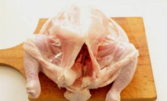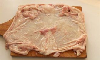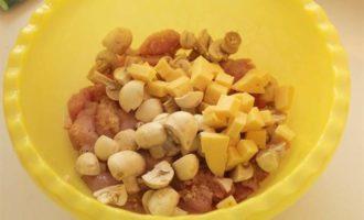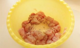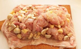 С курицы срезать мясо и порезать его средними кубиками приблизительно 2х2 см. Посыпать мясо солью, перцем и орегано. Добавить желатин. Хорошо перемешать.