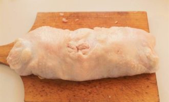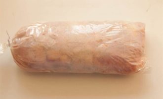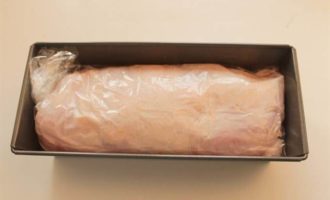 Поместить рукав в форму для запекания. Хорошо прижать сверху руками, равномерно распределяя мясо в рукаве по форме. Сверху в рукаве сделать несколько небольших проколов для выделения пара при запекании. Запекать в духовке 1 час при 170-180°С. Охладить. Поместить в холодильник на 5-6 часов, прижав сверху небольшим грузом.