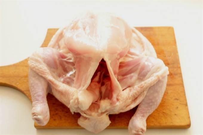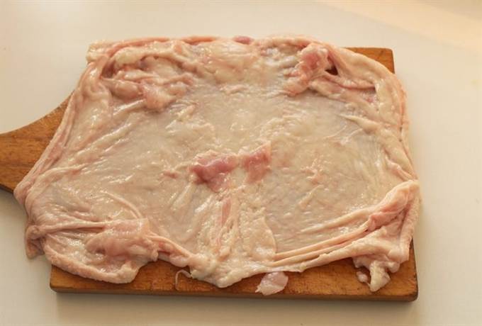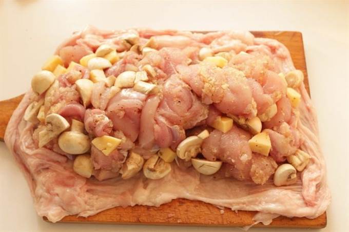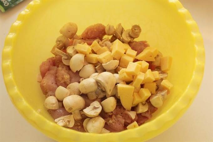 С курицы срезать мясо и порезать его средними кубиками приблизительно 2х2 см. Посыпать мясо солью, перцем и орегано. Добавить желатин. Хорошо перемешать.
