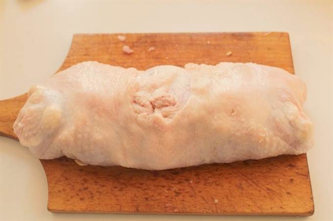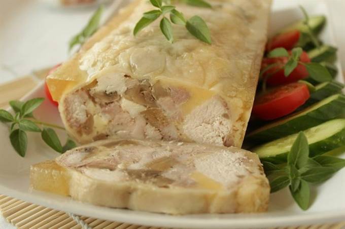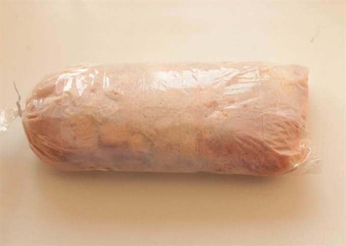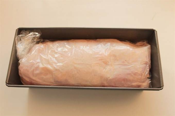 Поместить рукав в форму для запекания. Хорошо прижать сверху руками, равномерно распределяя мясо в рукаве по форме. Сверху в рукаве сделать несколько небольших проколов для выделения пара при запекании. Запекать в духовке 1 час при 170-180°С. Охладить. Поместить в холодильник на 5-6 часов, прижав сверху небольшим грузом.