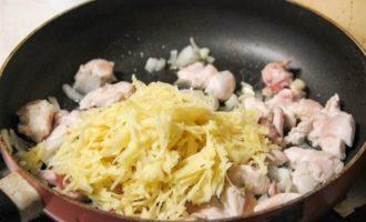 Очищенный картофель натираем на крупной терке, добавляем к куриному филе. Солим и перчим.