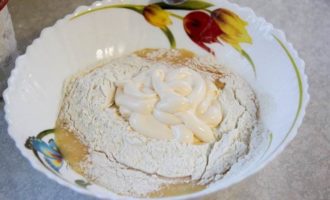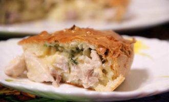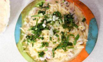 Начинку выкладываем на тесто, слегка отступив от краев. Покрываем ее сметанным майонезом. Натираем сыр, нарезаем зелень. Посыпаем поверх начинки. Выливаем оставшееся тесто. Запекать курник будем примерно 45 минут при температуре 180°С.