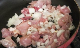 Филе нарезать небольшими кубиками. Обжарить вместе с луком.
