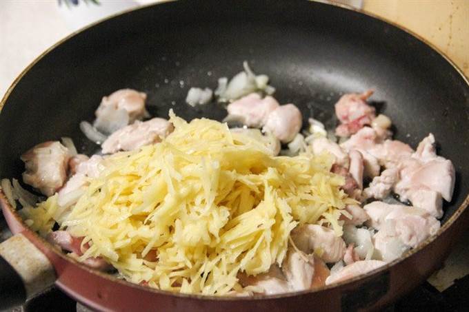 Очищенный картофель натираем на крупной терке, добавляем к куриному филе. Солим и перчим.