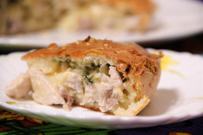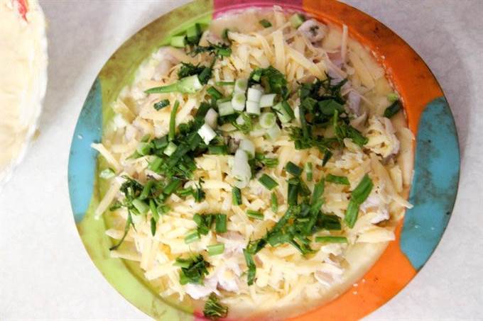 Начинку выкладываем на тесто, слегка отступив от краев. Покрываем ее сметанным майонезом. Натираем сыр, нарезаем зелень. Посыпаем поверх начинки. Выливаем оставшееся тесто. Запекать курник будем примерно 45 минут при температуре 180°С.
