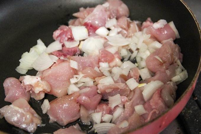 Филе нарезать небольшими кубиками. Обжарить вместе с луком.