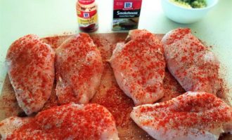 Куриные грудки обсушите тщательно бумажным полотенцем, затем щедро их посолите, поперчите и посыпьте паприкой с обеих сторон. Я в своем рецепте использовала подкопченные черный перец и паприку, они придают блюду необыкновенный аромат. Но, конечно же, можно использовать и классику.
