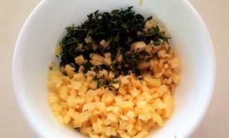 Порубите мелко чеснок, свежий имбирь и тимьян. Порубленные чеснок и имбирь должны быть примерно одного размера.