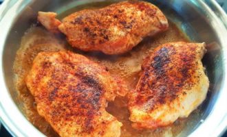 Обжарьте куриные грудки с обеих сторон (сначала с внешней, потом с внутренней) до золотистой корочки (примерно по 3 мин. с каждой стороны).