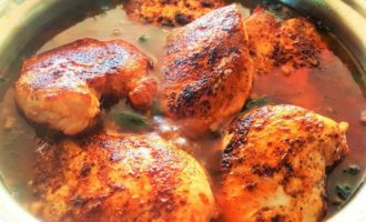 Положите куриные грудки, обжаренные ранее, в приготовленный соус, накройте вашу емкость фольгой или крышкой, и поставьте курицу в духовку (200°C) еще минут на 30-40.