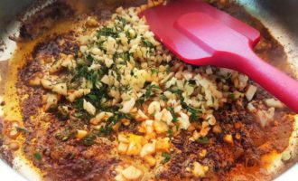 Переложите грудки временно в другую емкость. В образовавшийся соус после жарки курицы добавьте еще немного оливкового масла и потушите в нем смесь из чеснока, имбиря и тимьяна, подготовленную ранее (мин 2-3).