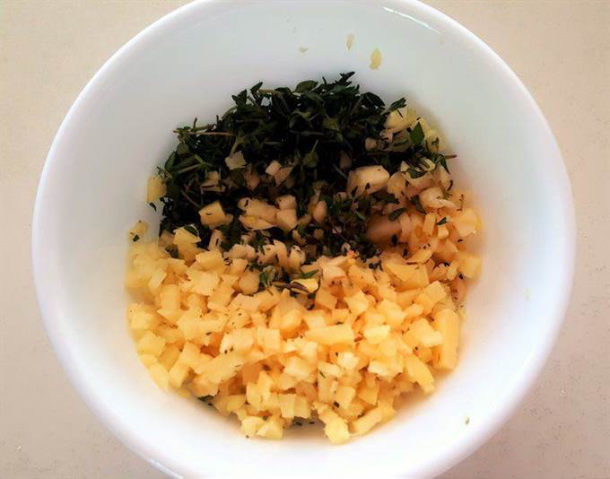 Порубите мелко чеснок, свежий имбирь и тимьян. Порубленные чеснок и имбирь должны быть примерно одного размера.