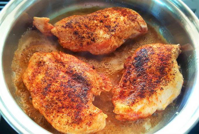 Обжарьте куриные грудки с обеих сторон (сначала с внешней, потом с внутренней) до золотистой корочки (примерно по 3 мин. с каждой стороны).