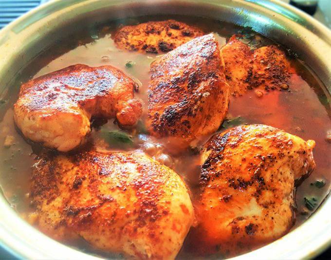 Положите куриные грудки, обжаренные ранее, в приготовленный соус, накройте вашу емкость фольгой или крышкой, и поставьте курицу в духовку (200°C) еще минут на 30-40.