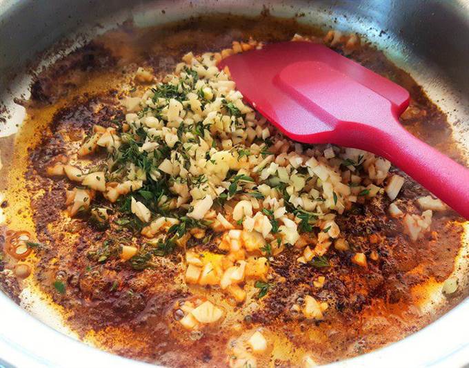 Переложите грудки временно в другую емкость. В образовавшийся соус после жарки курицы добавьте еще немного оливкового масла и потушите в нем смесь из чеснока, имбиря и тимьяна, подготовленную ранее (мин 2-3).