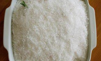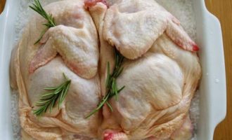 В форму для выпечки (желательно керамическую, или чугунную) насыпать 1 кг соли. Сверху уложить курицу кожей вверх. Воткнуть пару-тройку веточек розмарина (я подкладываю пару веточек и под курицу).
