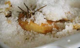 Сверху засыпать курицу оставшимся килограммом соли (может потребоваться чуть больше…), чтобы как следует закрыть тушку со всех сторон.