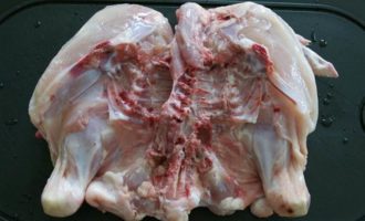 Духовку сразу включить разогреваться на 190-200 С. Подготовить курицу. Вымыть и разрезать ее с одной стороны (по грудке), чтобы разложить «бабочкой».