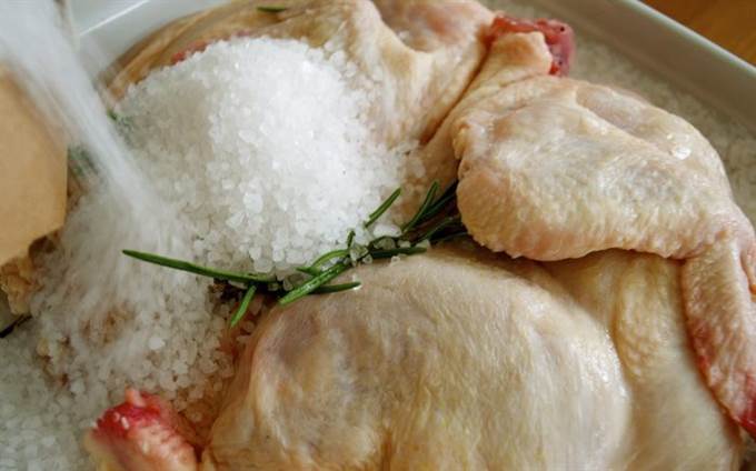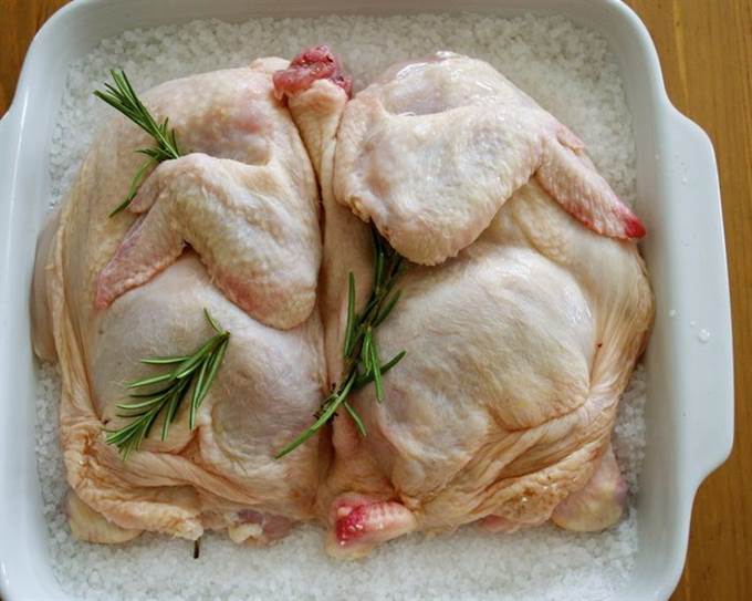 Сверху засыпать курицу оставшимся килограммом соли (может потребоваться чуть больше…), чтобы как следует закрыть тушку со всех сторон.