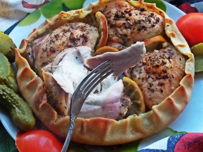Тесто подойдёт любое, у нас сделано простейшее из масла, воды и муки и соли.