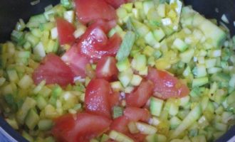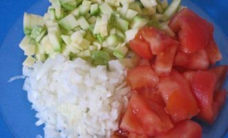 Лук очистить, нарезать мелкими кубиками. Молодой кабачок можно не чистить, нарезать мелкими кубиками. Помидор крупно нарезать.