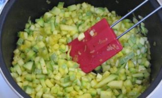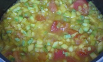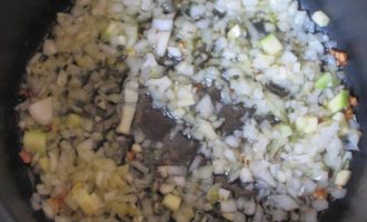 Через 2 минуты перемешать овощи, влить овощной бульон или воду.