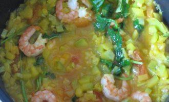 Когда помидоры станут развариваться, добавить отварные креветки и веточки петрушки. Кастрюлю накрыть крышкой и оставить на маленьком огне на 5 минут.