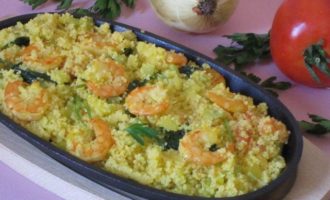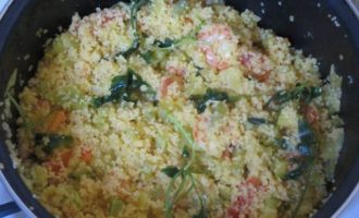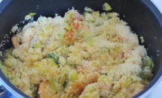 Затем выключить огонь, добавить кускус, перемешать. Накрыть крышкой и оставить на 5-7 минут.