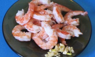 Креветки отварить до готовности. Чеснок мелко измельчить.