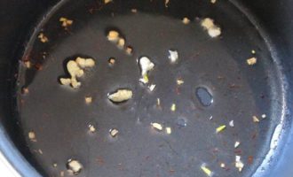 Нагреть масло в кастрюле. Добавить измельченный чеснок и шафран. Жарить 2 минуты.