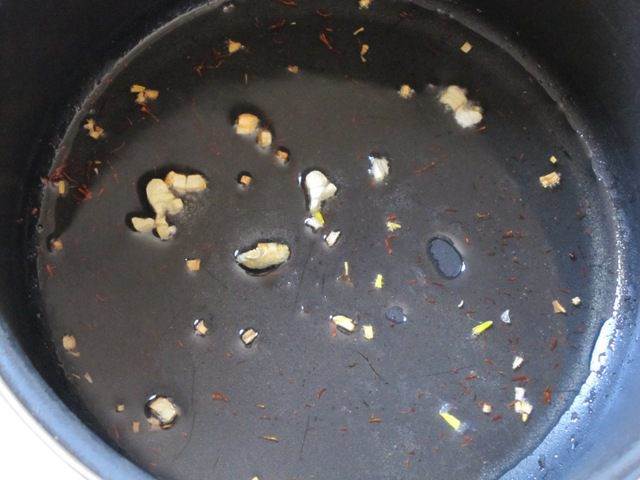 Нагреть масло в кастрюле. Добавить измельченный чеснок и шафран. Жарить 2 минуты.