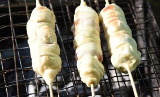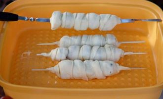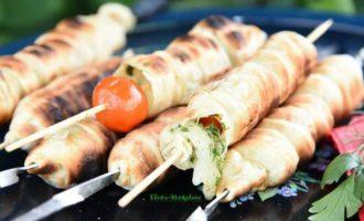 Слоёное тесто раскатать в большой прямоугольник. Толщина теста около 3 мм. Разрезать на длинные полосы шириной 3-4 см. Каждый шашлык обернуть тестом, обвивая спиралью внахлёст. Следить, чтобы не было открытых участков, иначе подтаявший сыр может вытечь. Тщательно закрепить концы теста.