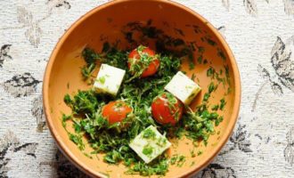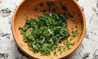 В миску с зеленью добавить измельченный чеснок, соль. Хорошо помять (пестиком или вилкой) так, чтобы зелень дала сок.
