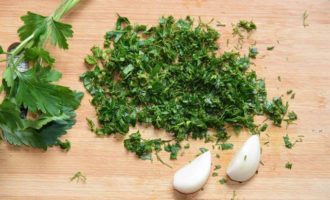Приготовим ароматную часть. Укроп и петрушку помыть и мелко порезать. -