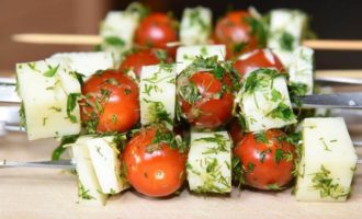 Попеременно нанизать на шампур. (Кстати, где-то прочитала, что помидоры лучше нанизывать через боковые поверхности, а не вертикально вдоль плодоножки. Так меньше вытекает сока).