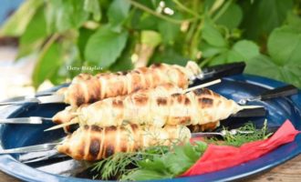 Выложить шашлыки на решетку гриля (или мангал). Угольки должны быть мелкие, лежать плотно. Жар от углей умеренным, не сильным. Внимательно жарить кебаб, ни на минуту не отвлекаясь, постоянно поворачивая шампуры для равномерного прогрева и подрумянивания. Мне понадобилось около минуты на каждую сторону.