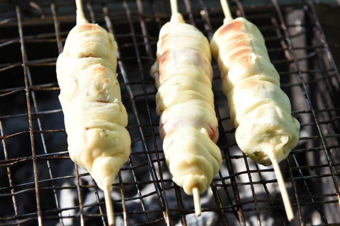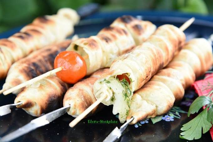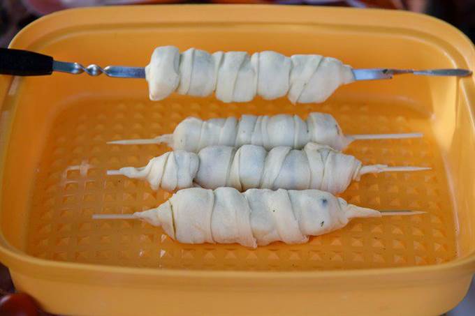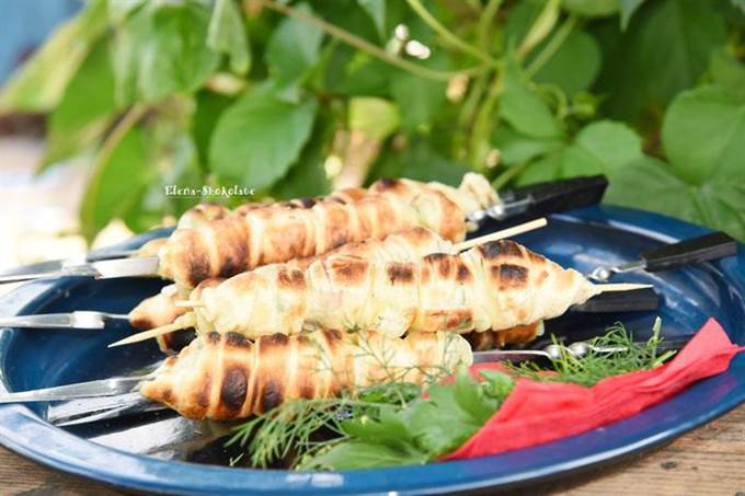 Слоёное тесто раскатать в большой прямоугольник. Толщина теста около 3 мм. Разрезать на длинные полосы шириной 3-4 см. Каждый шашлык обернуть тестом, обвивая спиралью внахлёст. Следить, чтобы не было открытых участков, иначе подтаявший сыр может вытечь. Тщательно закрепить концы теста.