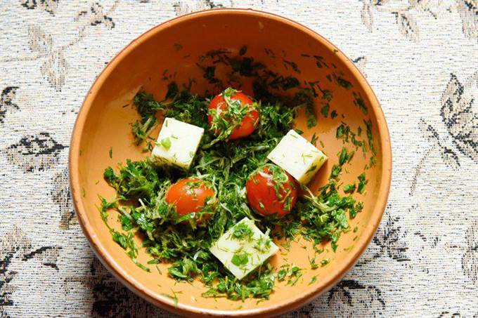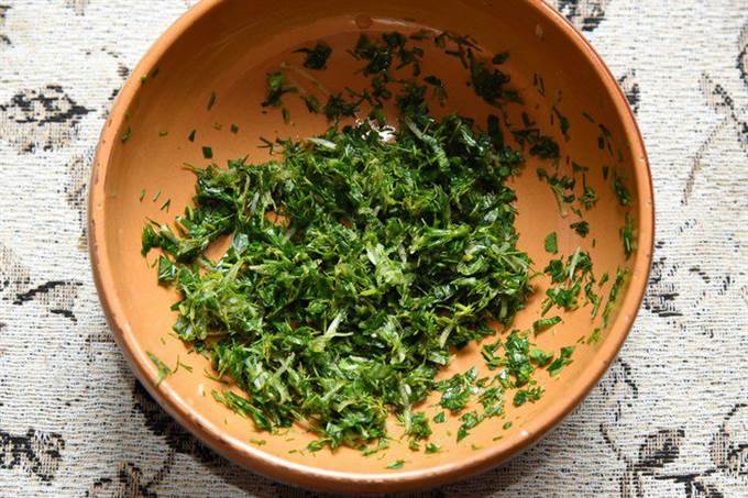 В миску с зеленью добавить измельченный чеснок, соль. Хорошо помять (пестиком или вилкой) так, чтобы зелень дала сок.