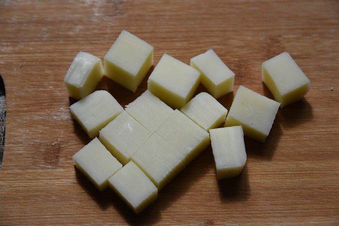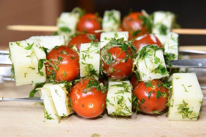 Помидоры (у автора — «бакинские») порезать четвертинками (или, если небольшие, половинками). Я же использовала помидоры черри, чей размер очень хорошо подходил для этих шашлыков (купить их оказалось проще, чем найти бакинские помидоры). Сыр сулугуни нарезать кубиками размером с помидор. Автор пробовал с сыром маасдам, но говорит, что получается «не то» — с сулугуни гораздо вкуснее.